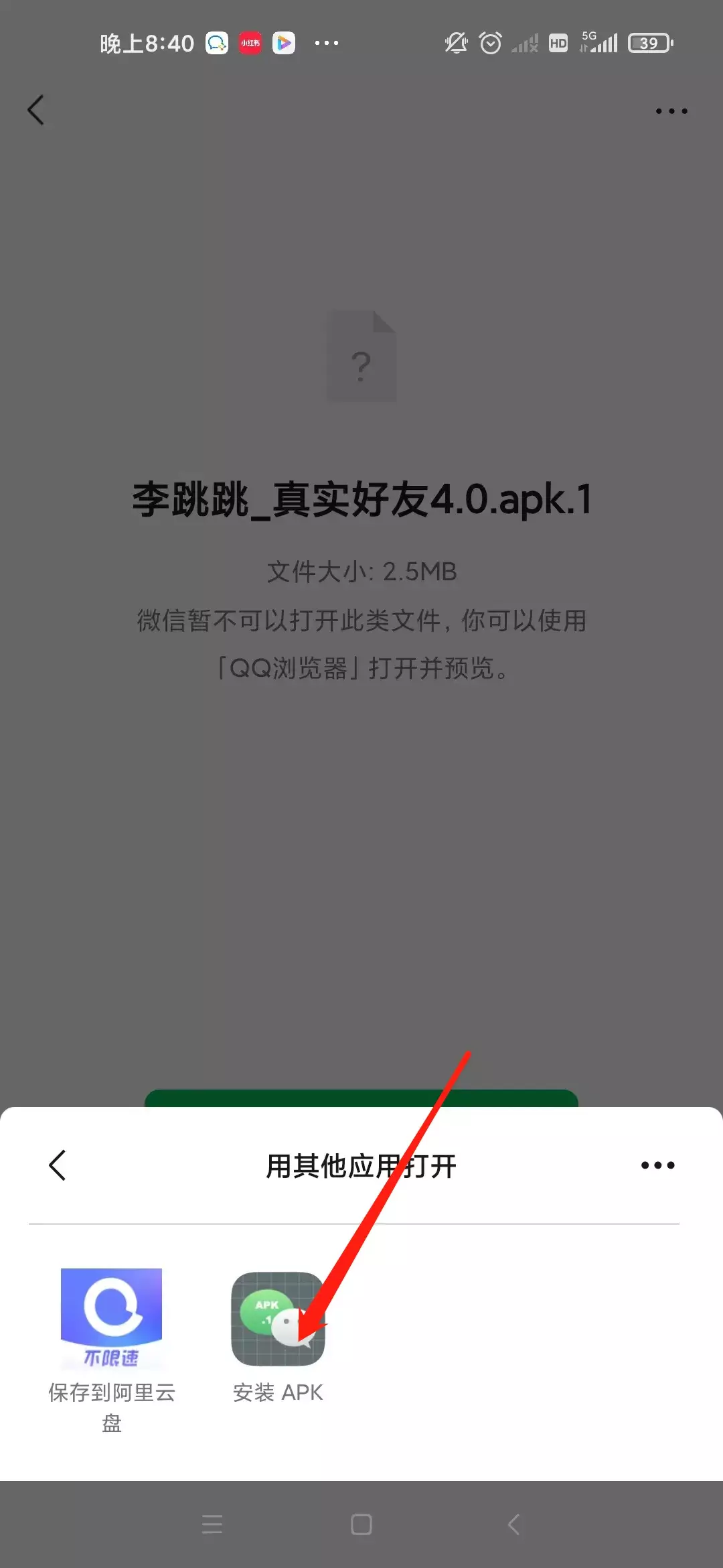 在手机上先保存apk文件,这时已经被自动改成**.apk.1了,点击【用其他应用打开】