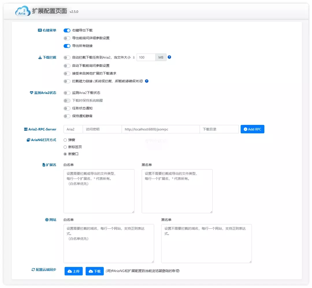 安装好后可以进入扩展配置页面设置功能,包括右键菜单、下载拦截设置,可设置拦截设定的 ≥ 文件大小、拦截磁力链接、监测 Aria2 下载状态、扩展名白名单 / 黑名单;网址白名单 / 黑名单等。