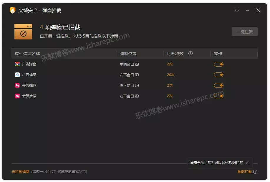 弹窗拦截,火绒最受欢迎的小工具之一,它可自动识别并拦截常见软件的弹窗,当然也可以通过截图来手动识别弹窗。