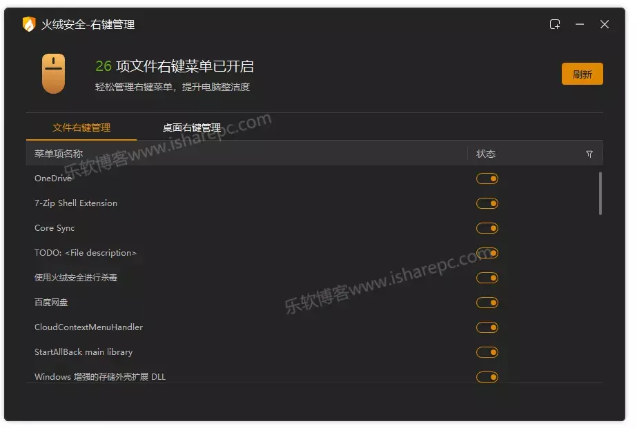 火绒的右键菜单管理,小巧但是功能强大,起码能正确罗列出添加在桌面、文件等右键的菜单项,你可以快速禁用这些项目。