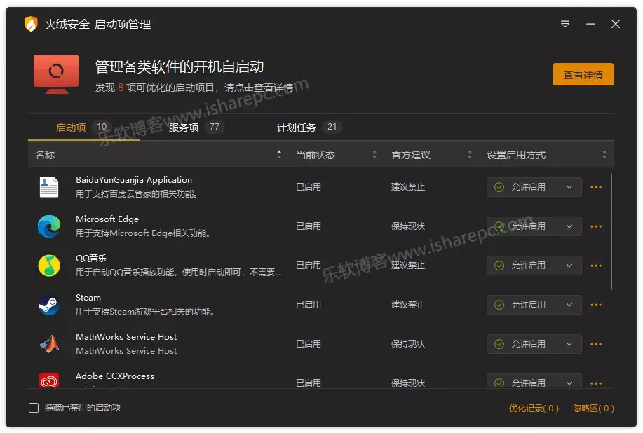 启动项管理,可以一键扫描出开机启动的项目,包括自启动的软件、计划任务以及服务,可以快速禁用,效果非常好。