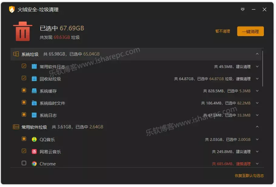 火绒的垃圾清理,可以一键扫描出系统垃圾以及常见软件的缓存垃圾,实际效果相当好,可以一键清理各种垃圾缓存。