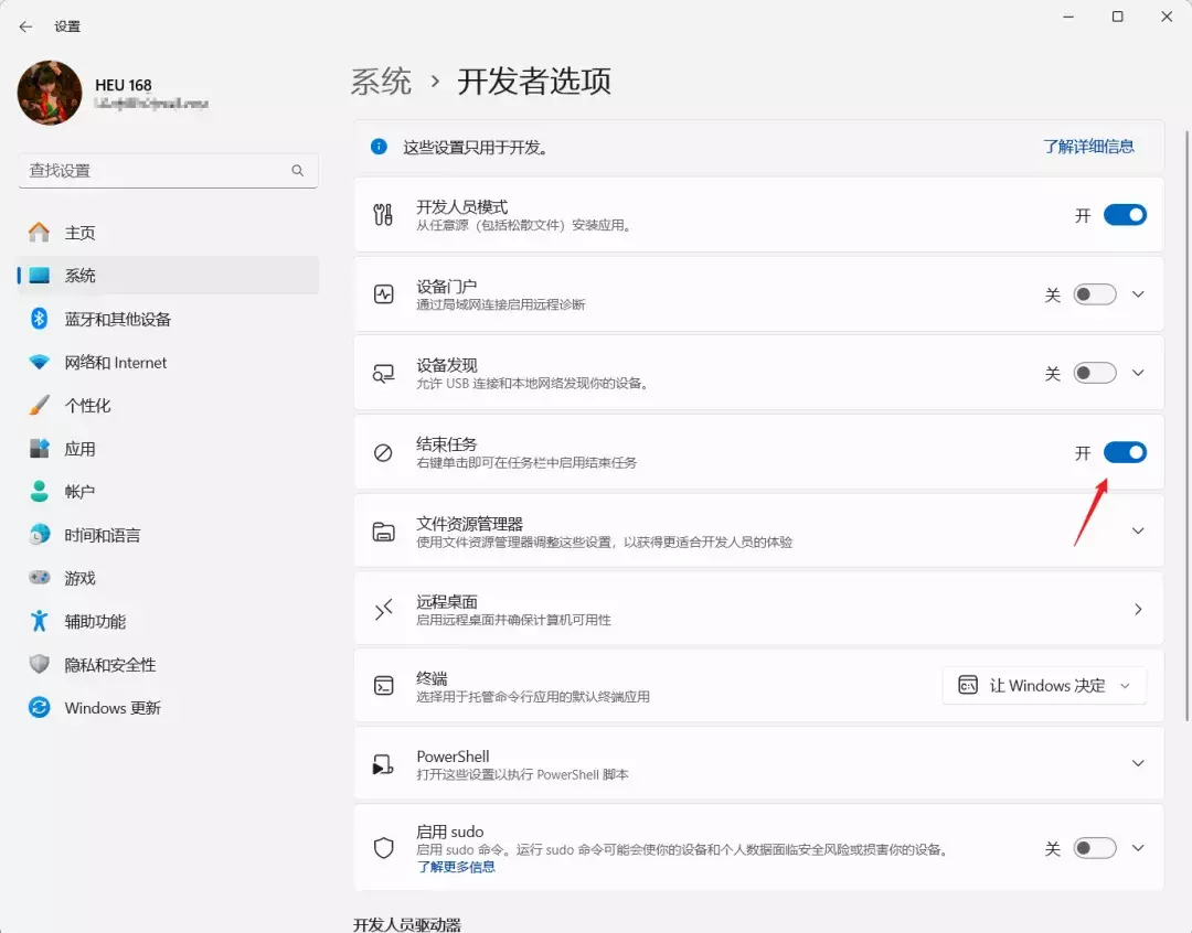 如果某程序出现卡顿等现象,想要结束进程,通常会在任务管理器中结束,但是需要操作好几个步骤,现在Windows11中可以直接使用鼠标右键结束任务。但是需要启用该功能:设置→系统→开发者选项,将“结束任务”的按钮打开。这样以后只需在任务栏中使用鼠标右键即可结束任务。