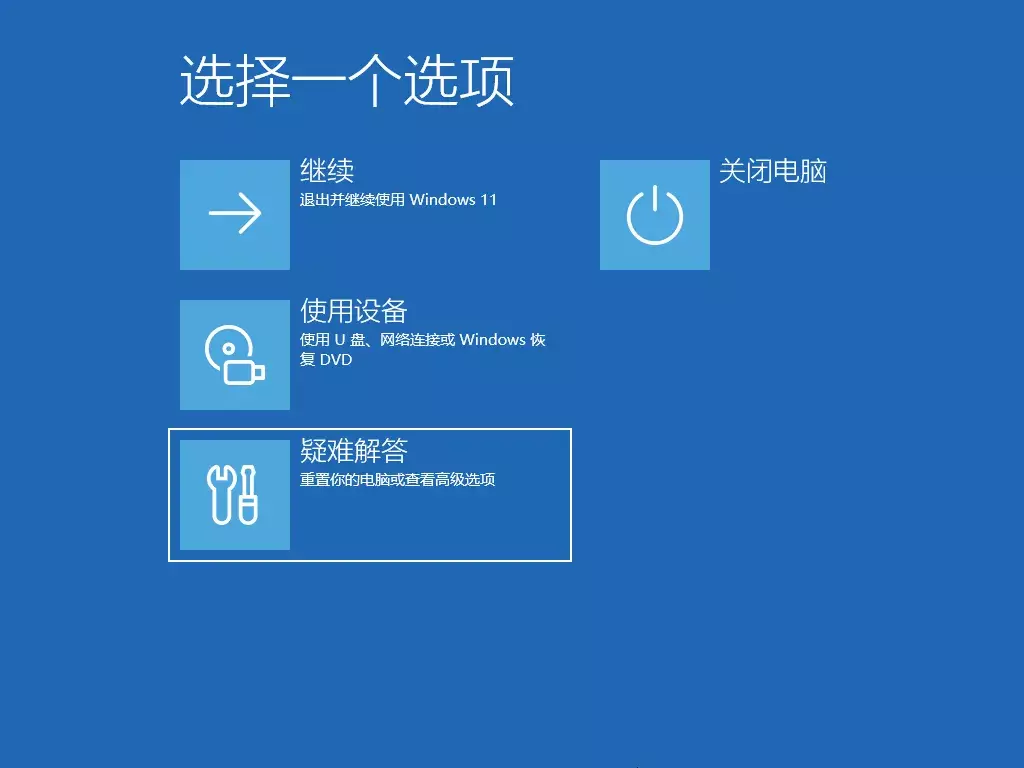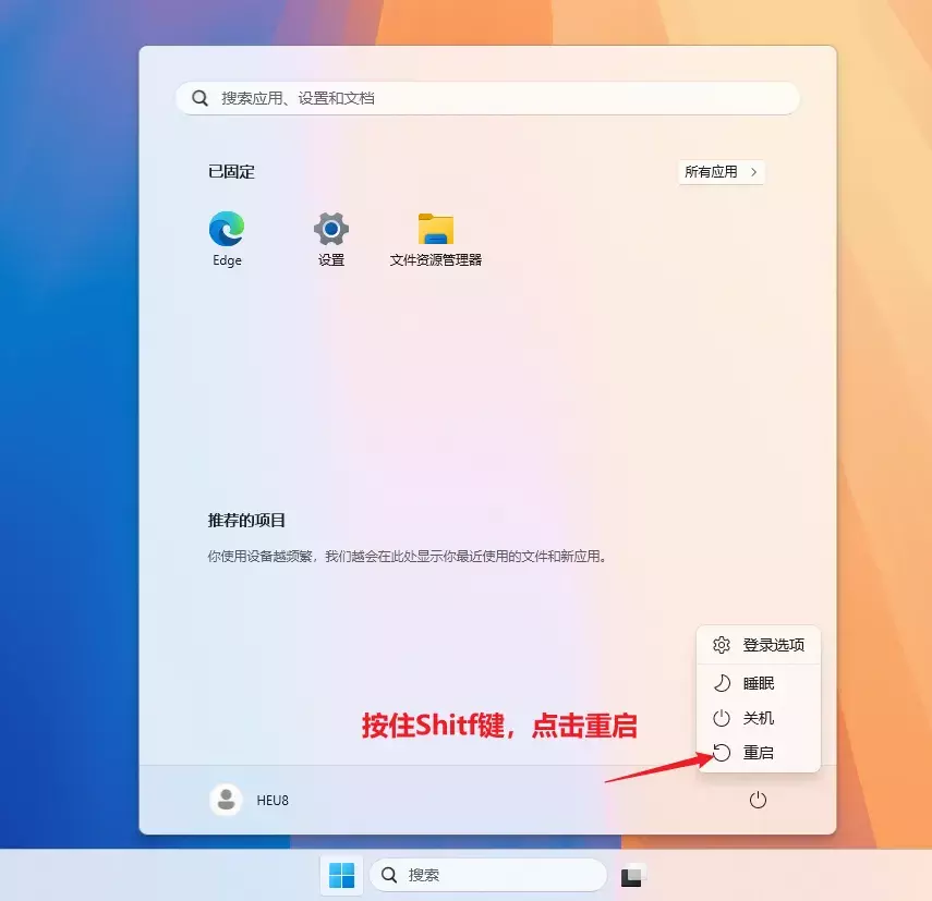 在开始菜单中,点击电源按钮,可以看到“睡眠、关机、重启”等选项,这时按住键盘上的Shift键,然后鼠标点击“重启”,即可进入Win11的RE环境中。该环境下可以进行故障排除等一些操作。
