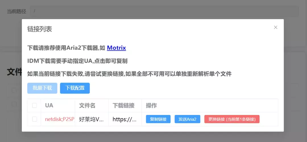 双击底部文件列表的文件,网页上会弹出最终的解析链接以及 UA,如果使用 IDM 一类的下载器,则需要在下载器中指定 UA,也就是用户代理。