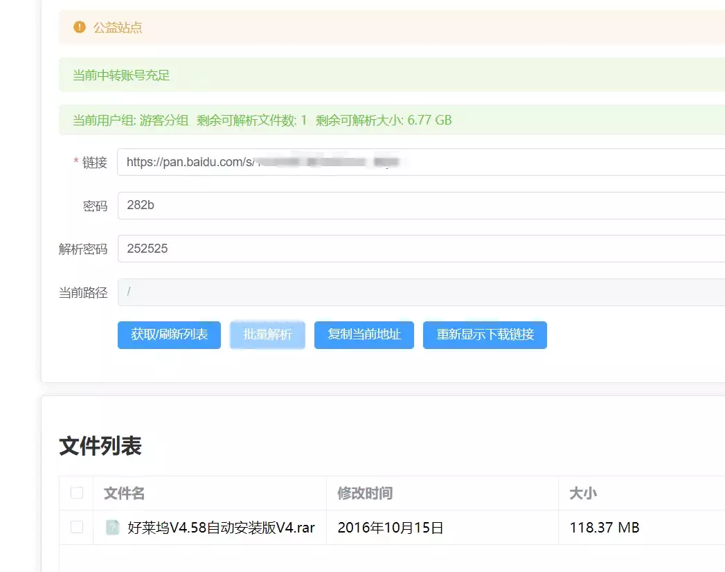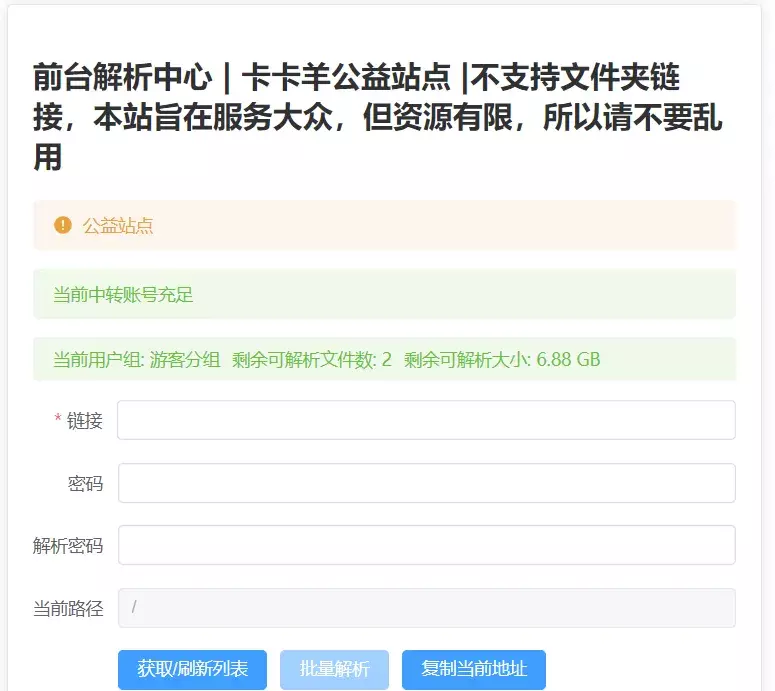 这是一个带有公益性质的免费网站,网站可以为用户提供免费的百度网盘解析服务,不过每一个使用者每天都有限制,并非可以无节制使用。