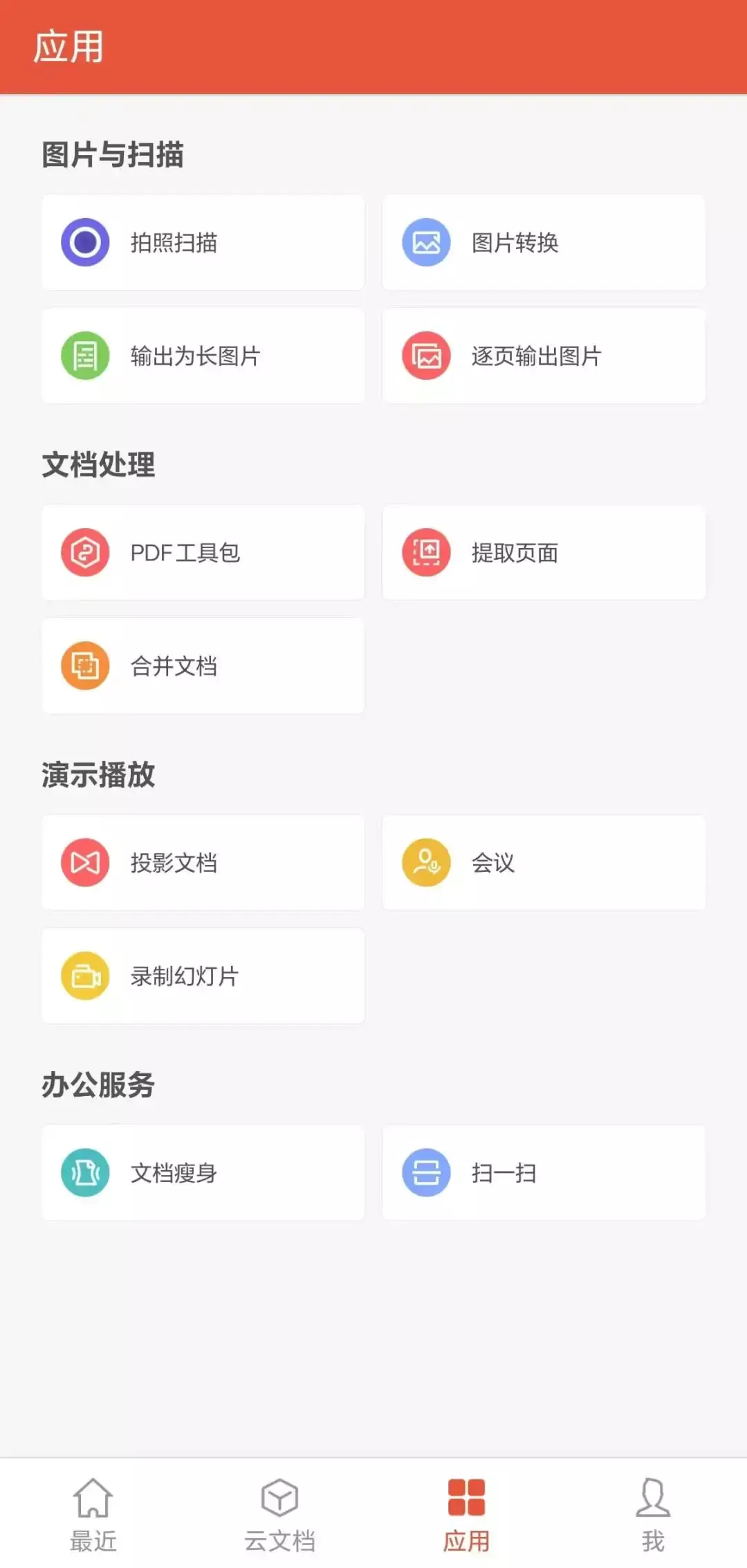 登录之后能够同步多个平台的云文档,在应用这里,包含图片与扫描、文档处理、演示播放三大类。