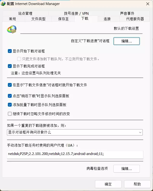 IDM 配置 UA 的位置在下载-选项-下载,记得点击确定保存 UA,UA 并非一成不变,有时可能会有变化。