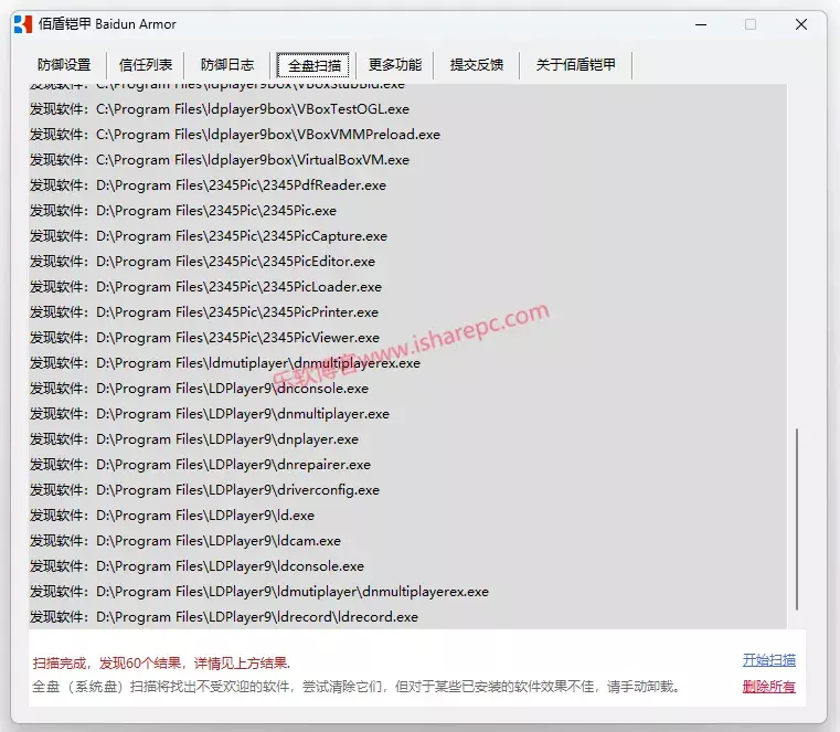 所以,全盘扫描后不要一杆子全部删除,不认识的或心存疑虑的exe,网上搜索下相关信息,再判断是否删除。