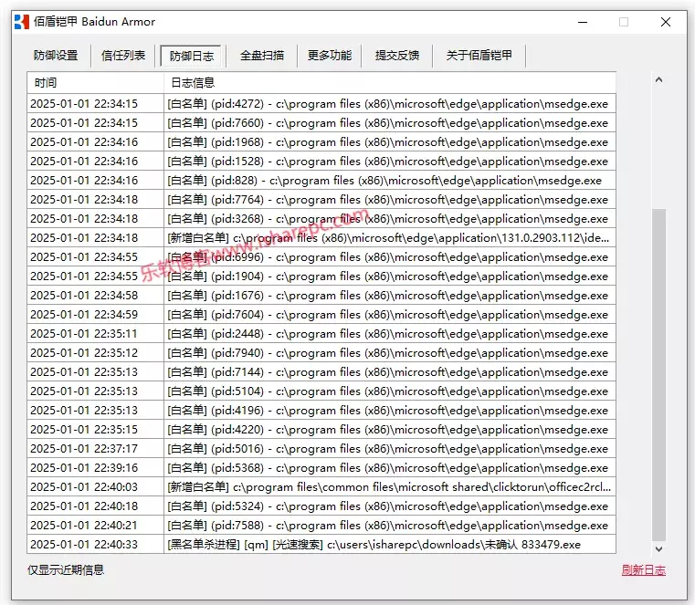 拦截后我们也可以在防御日志里看到详细的记录,包括自动设置白名单、黑名单杀死进程等等,一目了然。