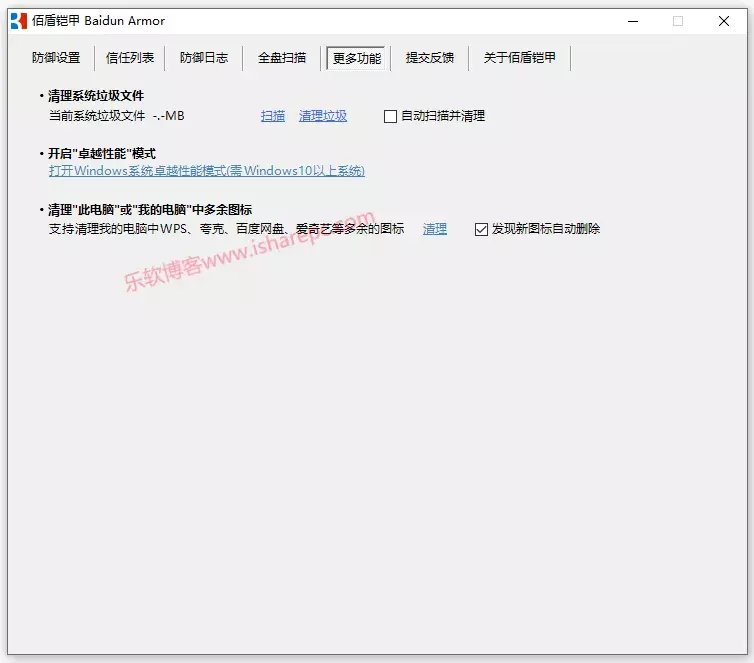 Baidun Armor有一个“其他功能”,提供了包括垃圾清理、开启windows性能模式、以及删除“此电脑”“我的电脑”中的多余图标