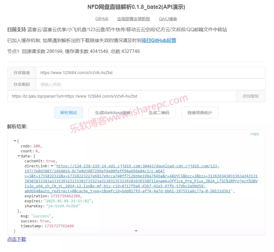 开发者提供了一个在线网址,使用简单,只要把网盘的分享粘贴后,点击解析即可获取到直链。