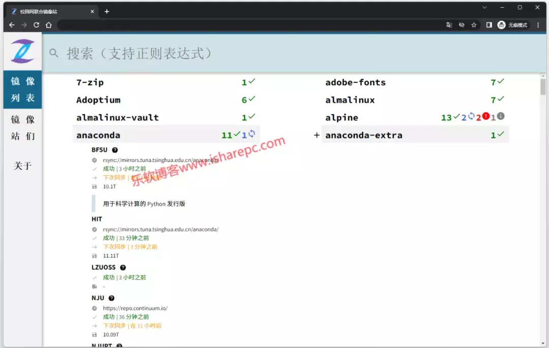 网站可以查看镜像列表,列出了站点目前索引的所有内容,并且它支持正则搜索,可以查看是否同步,同步的时间以及文件的大小。