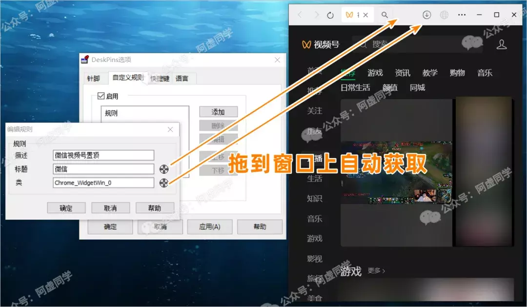 Deskpins 有一个最大的优势是支持自定义规则自动置顶一些窗口,以微信视频号为例,通过拖动十字获取窗口的标题和类之后,保存设置,下次再打开微信视频号的窗口就会被自动置顶了😲