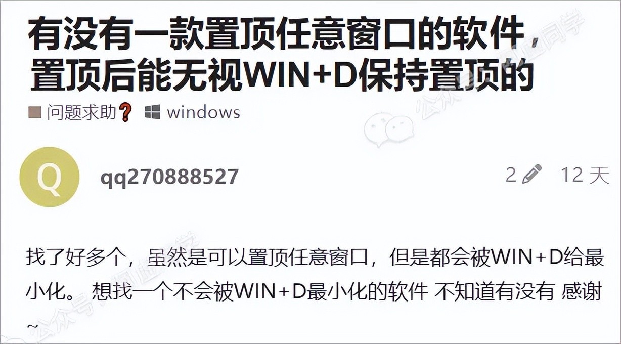 而如果你办公中经常打开各种各样的程序、文件,会经常用到 WIN+D 最小化所有窗口,可能就会像下面这位老哥一样:需要一款能无视 WIN+D 保持置顶的软件🤨