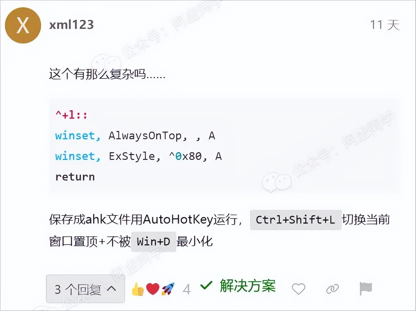 而在这位老哥提问帖下面,有位大佬给出了可能算是最简洁好用的解决方案,利用阿虚之前介绍过的AHK,仅需 4 行代码就能完美实现这个需求