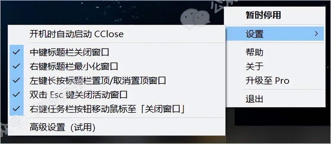另外 CClose 也支持同时置顶多个窗口,并且还可以进一步实现中键标题栏关闭窗口、右键标题栏最小化窗口、双击Esc键关闭活动窗口等,有需要可以自行设置