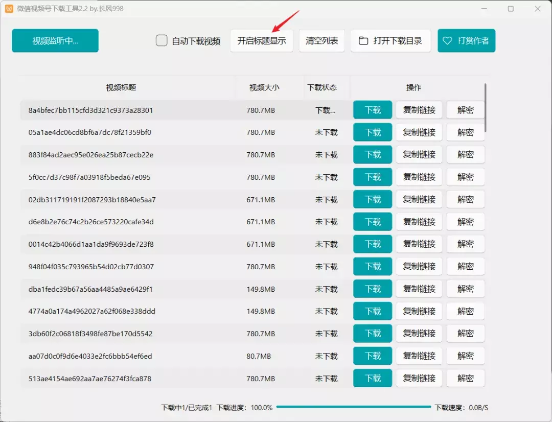 到这里可能在开启显示标题的时候遇到一些bug,比如闪退、无法显示中文标题等。可以尝试的方法:以管理员身份运行软件、多次重启软件、多次重复上述步骤。如果不开启显示标题,软件运行起来还是很正常的,就是下载时稍微麻烦了点,因为全是字母和数字,有时可能会下载错~先关注这个项目,说不定哪天作者更新修复了这个问题。