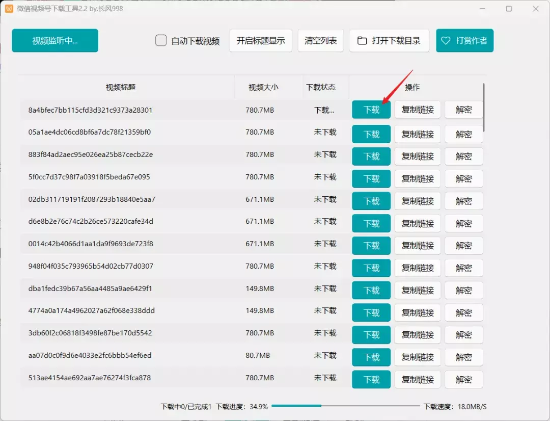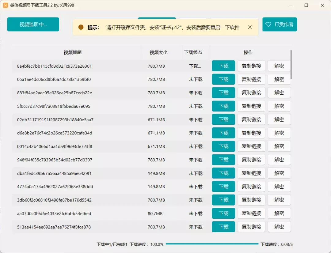 然后运行微信,打开视频号(微信主界面的左侧),进行播放视频,这时可以看到下载工具的主页面中会出现很多视频,我们点击相应视频后面的“下载”即可。也可以点击“复制链接”,然后使用IDM等下载工具进行下载。