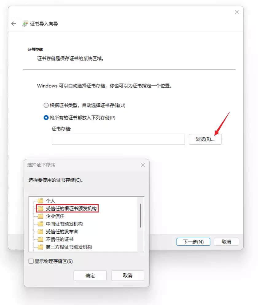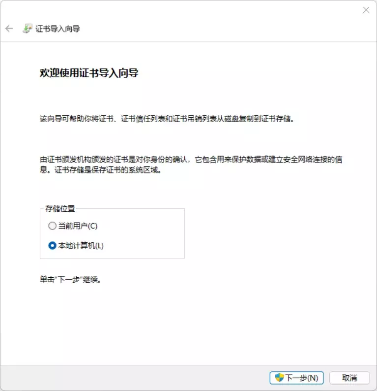 打开软件同目录下的“缓存”文件夹,这里面自动生成了两个证书:证书.p12、证书-cert.p12。这两个都安装,方法一样。这里仅展示其中一个的截图,首先双击证书文件,注意下图中的选择:存储位置选择本地计算机、证书存储到受信任的根证书颁发机构。其它均保持默认,遇到输入密钥的步骤也不用管,一路点击“下一步”即可安装成功。