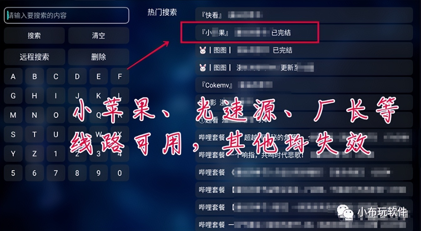 软件主界面如上图所示,首页显示热门影视,有需要的朋友可以直接点击。点击后会出现下面的实现界面,这也是搜索的界面。大家可以看到许多的源,目前众多源已经失效,兔兔测试后,小苹果、光速源、厂长可以观看。