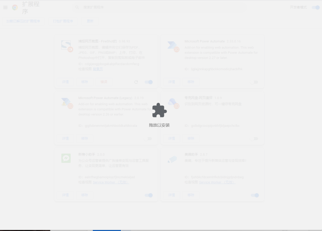3、直接将 .crx 文件拖到浏览器中间来,如图所示: