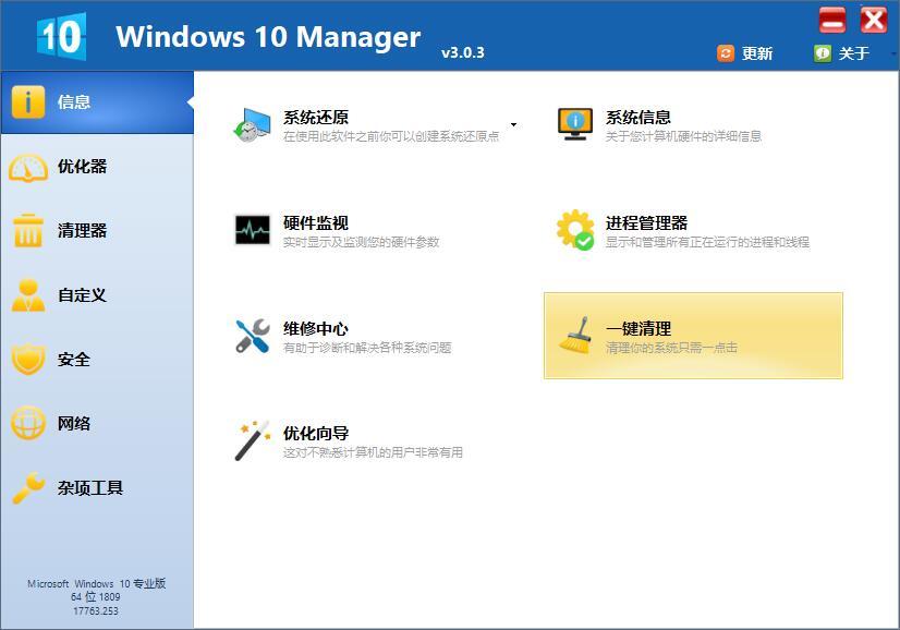 信息:获得系统和系统上的所有硬件的详细信息;帮你找出的Windows,Office产品安装密钥;显示运行在你机器上进程和线程的详细信息;Windows 10 Manager提供1点击清理功能自动清扫系统;维修中心可以帮助您解决各种系统问题。