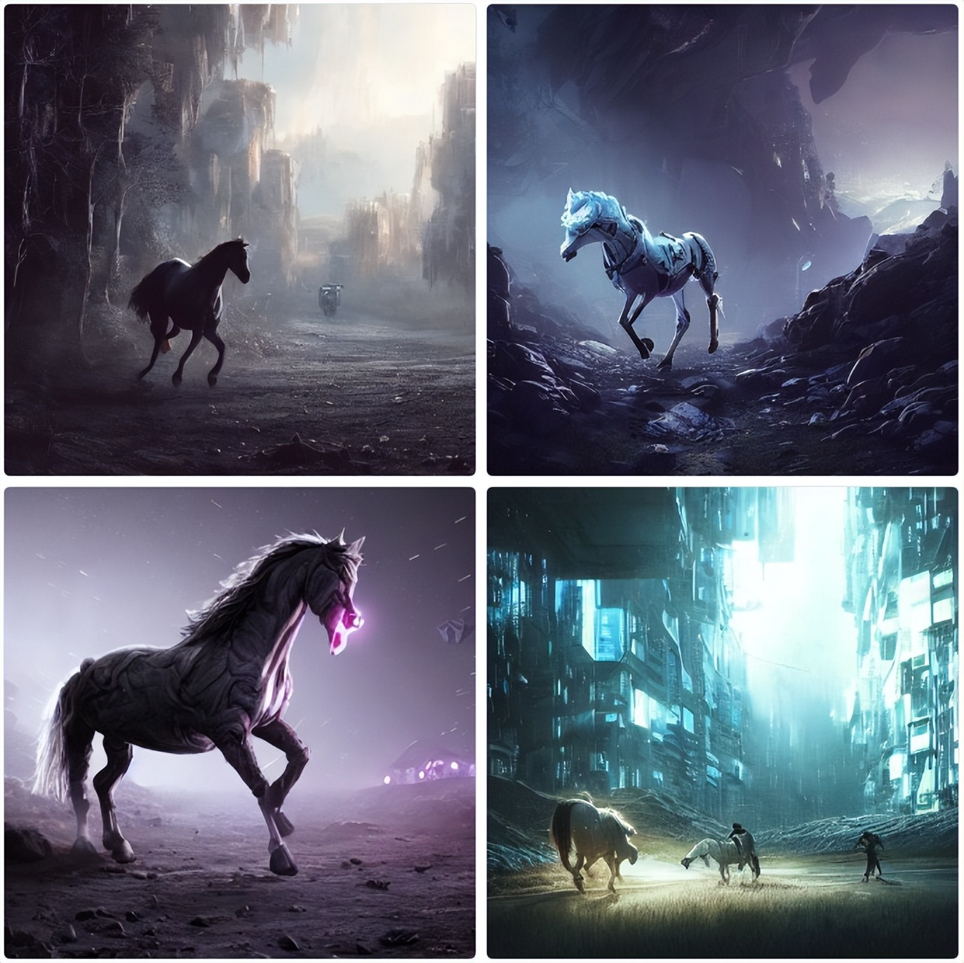 关键词:A silver mech horse running in a dark valley, in the night, Beeple, Kaino University, high-definition picture, unreal engine, cyberpunk