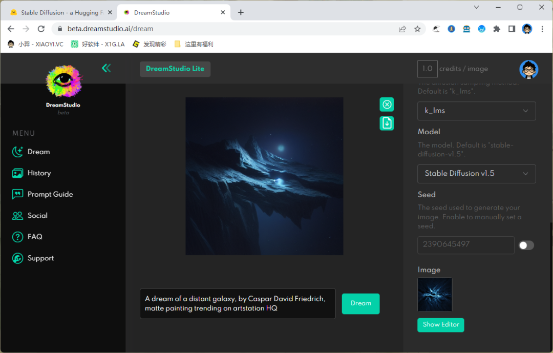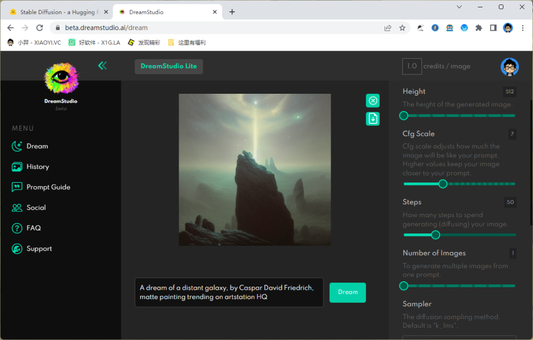 另外官方也还发布了 DreamStudio Beta 公测版,需要注册登录,但是有积分限制,每次生成图片都会消耗积分,积分用完得付费购买。