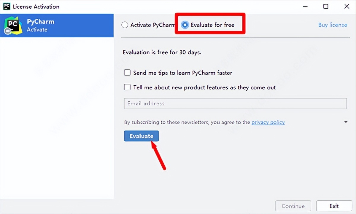 1.先下载安装包和破解补丁压缩包,然后安装安装包,启动你的IDE,如果上来就需要注册,选择:试用(Evaluate for free)进入IDE;