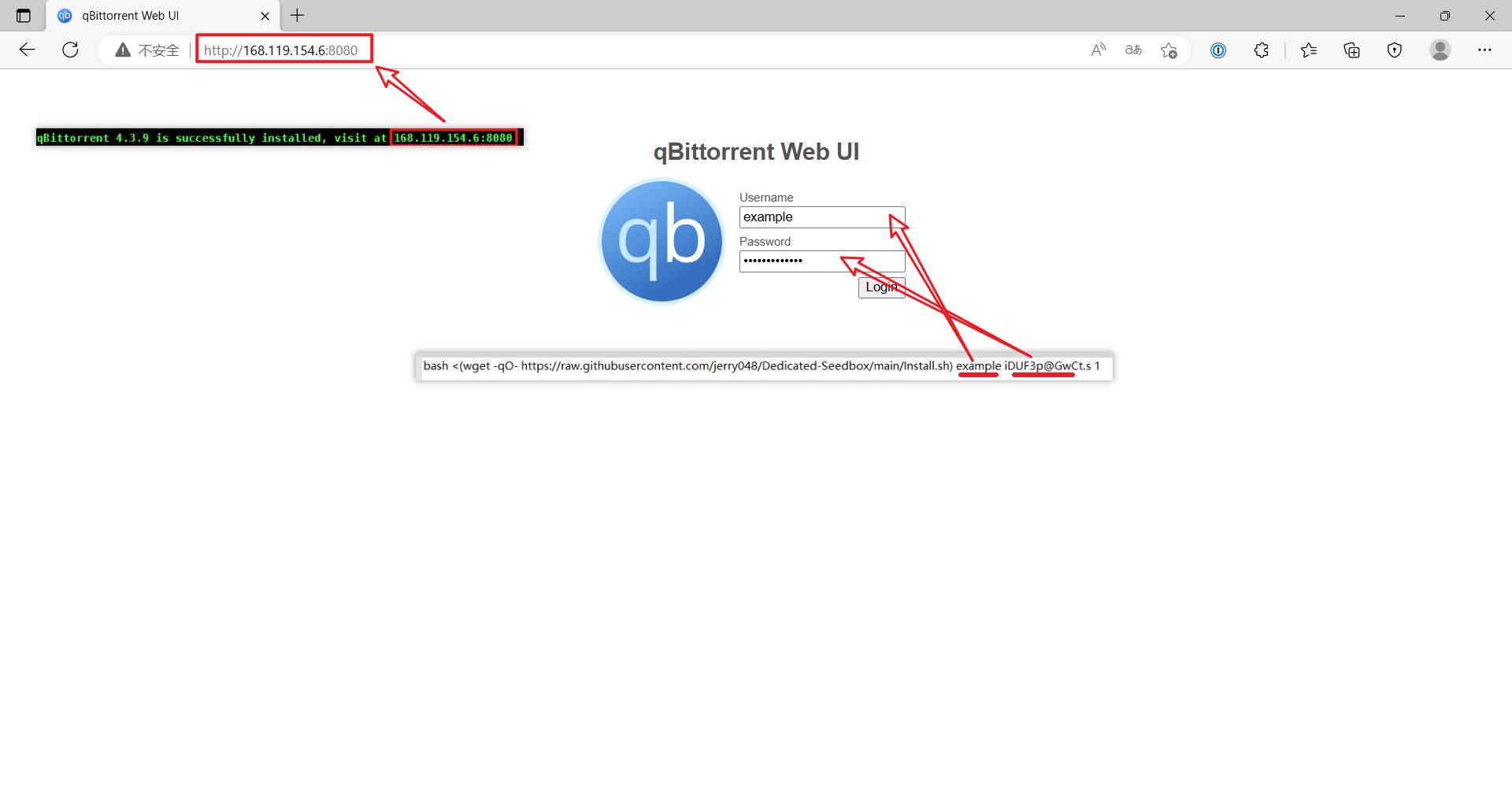 bash <(wget -qO- https://raw.githubusercontent.com/jerry048/Dedicated-Seedbox/main/Install.sh) <用户名称> <用户密码> <缓存大小(单位:GiB,且为整数)>
