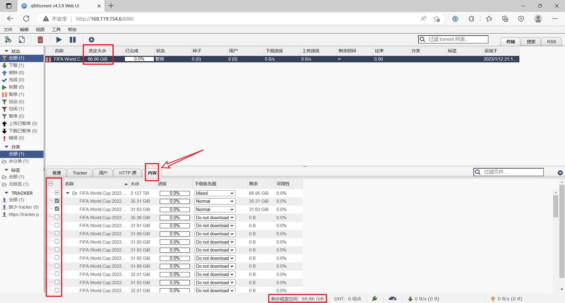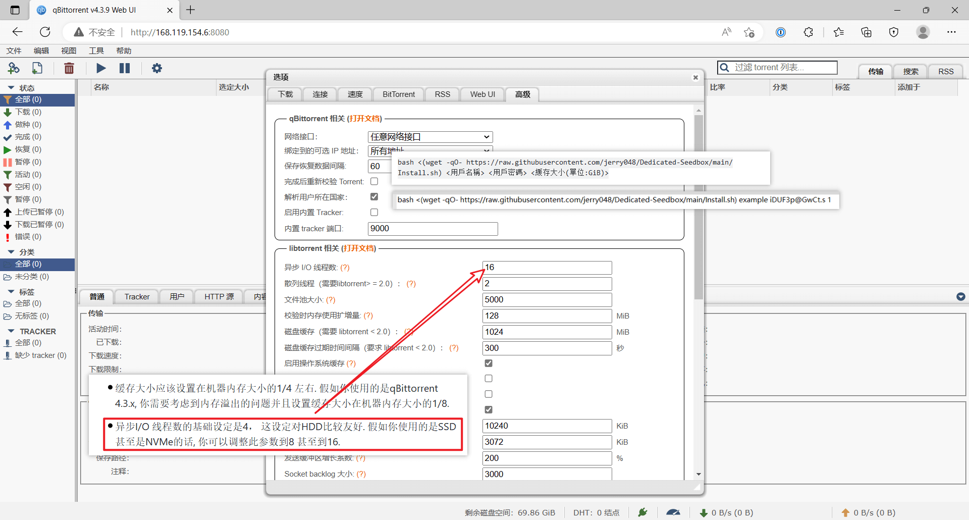 缓存大小我们在执行一键脚本的时候设置过,选择的是 1 GiB,即图中的 1024 MiB。我们安装的 qBittorrent 版本为 4.3.9,按照文档,缓存大小应设置为机器内存大小的 1/8(即 512MiB),但经过我实测,设置为 1 GiB 也行,服务器不会崩溃,所以就保持 1024 MiB 不动: