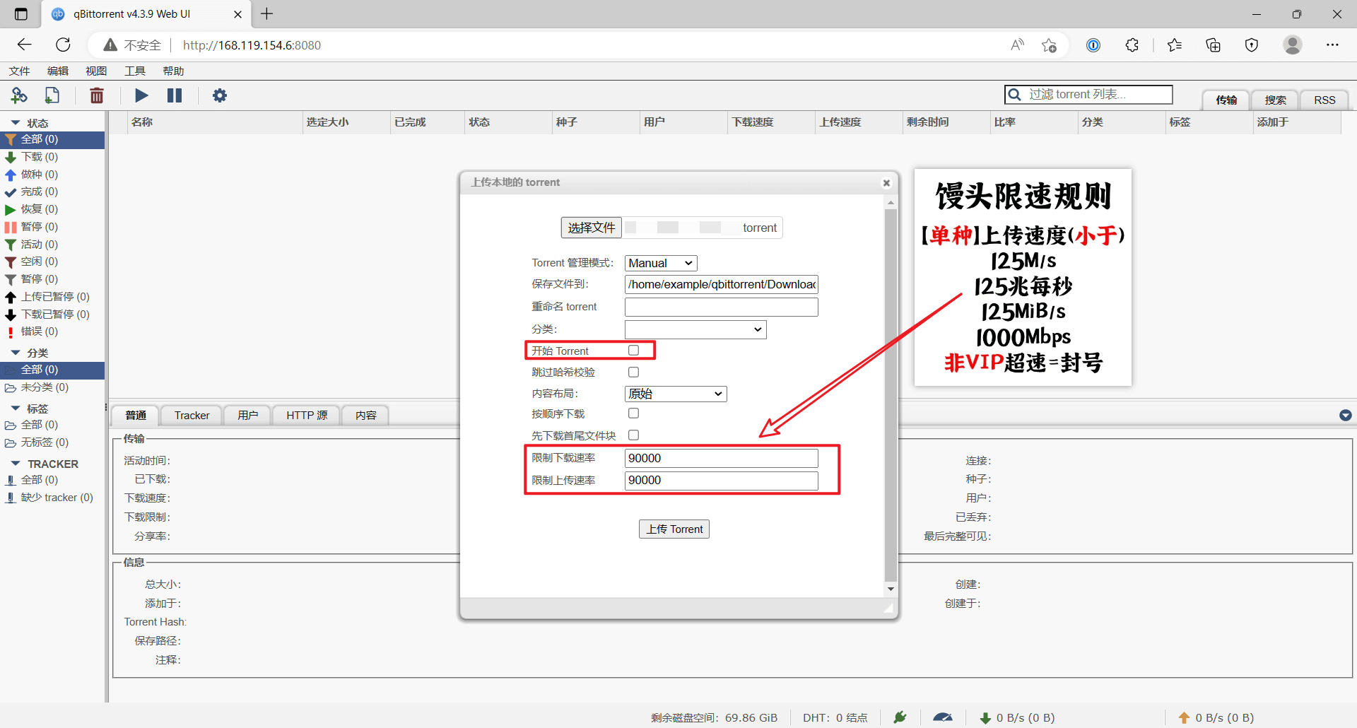 我们硬盘只剩 70 GiB,肯定装不完一个完整的大包,所以我们需要拆包,为了便于拆包,我们选择不自动开始。同时做好限速,我限速为 90000 KiB/s,求稳: