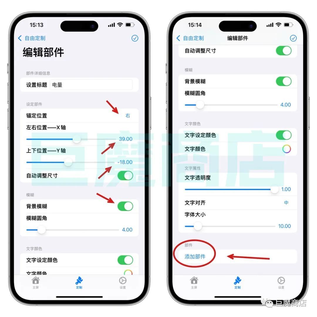 然后进入编辑界面,锚定位置选择 右,左右位置X轴选择39,上下位置Y轴选择-18,点击背景模糊,往下拉,看到最下面,点击添加部件。
