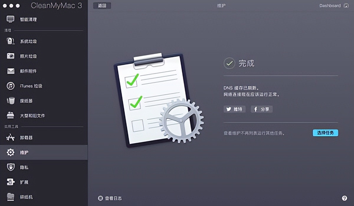 (2)使用CleanMyMac来清除mac中dns缓存,使用这样的软件来进行清理是再简单不过的,cleanmymac的清理工作做得十分到位,其中也包括了缓存的清理,操作简单,启动cleanmymac之后选择“维护”后我们会看到右边陈列出来的一些系统维护选项,其中就有“刷新DNS缓存”,我们可以随时做清除工作。