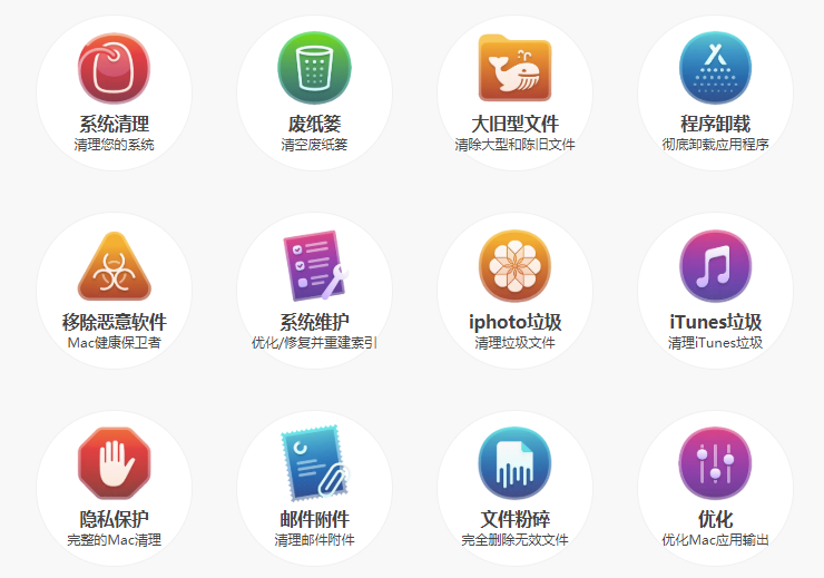 CleanMyMac X 4.6.12更新了恶意软件数据库和检测规则文件清理功能:系统垃圾文件清理、相册文件清理、邮件垃圾清理、iTunes备份文件清理和废纸篓清理;系统安全功能:恶意软件清理与隐私保护功能;系统加速:启动速度优化与磁盘性能优化等;软件管理:软件卸载、软件更新等功能;文件管理:大文件与旧文件清理以及文件粉碎机等。