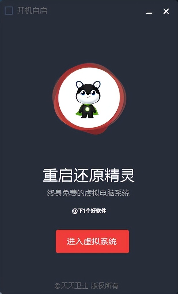 重启系统后,再次运行「重启还原」软件,点击进入虚拟系统按钮。然后就处于虚拟系统状态了。左上角有个开机自启,开不开都行,只要进入虚拟系统,重启系统都会处于虚拟环境。