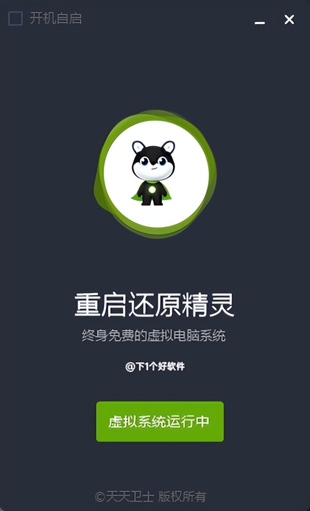 如果你不需要虚拟系统了,也很简单,再次运行「重启还原」软件,点击下虚拟系统运行中的按钮,就会退出了。
