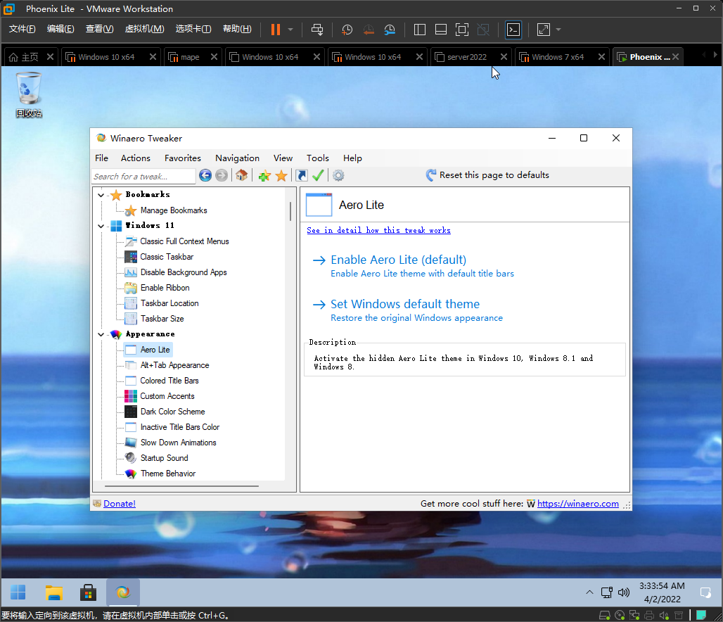 值得一说的是 Winaero Tweaker 软件,提供了非常丰富的系统调整项、美化项,例如还可以开启 Aero Lite 效果。不过内置的版本没有汉化,大家可以从网上找下汉化版。