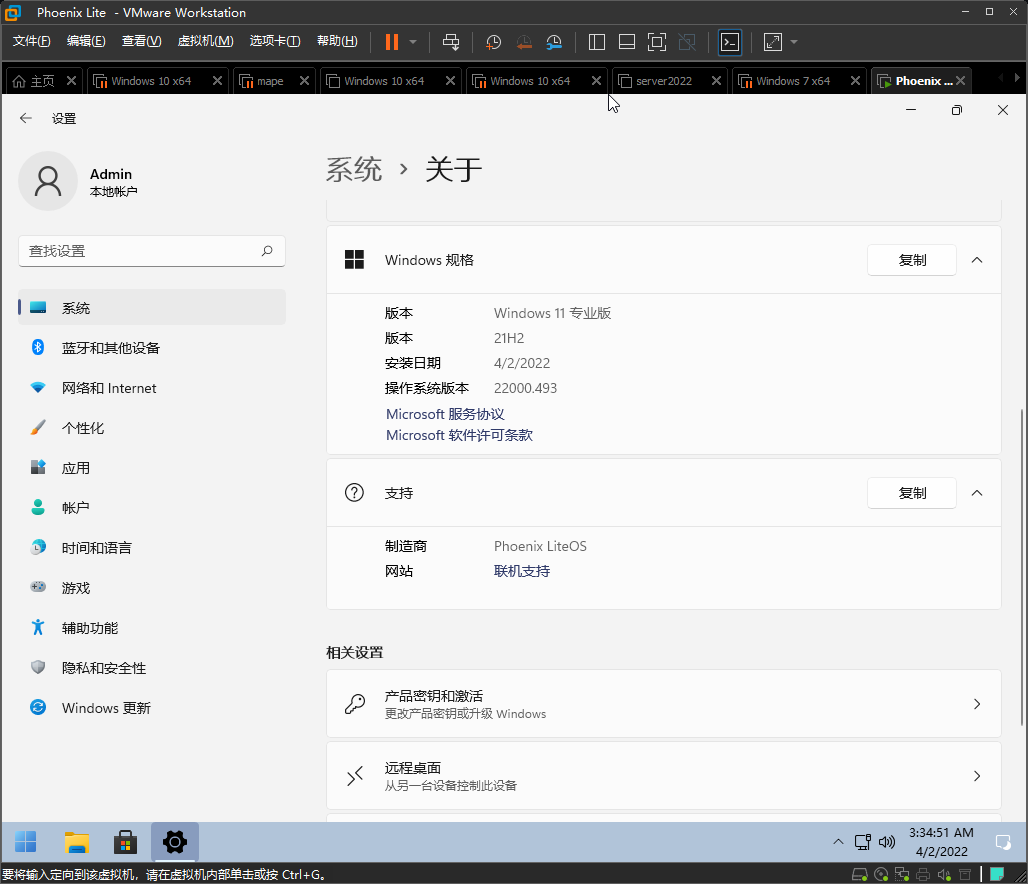 从系统的关于里面可以看到是基于 Win11 22000.493 版本制作,采用的是专业版本。