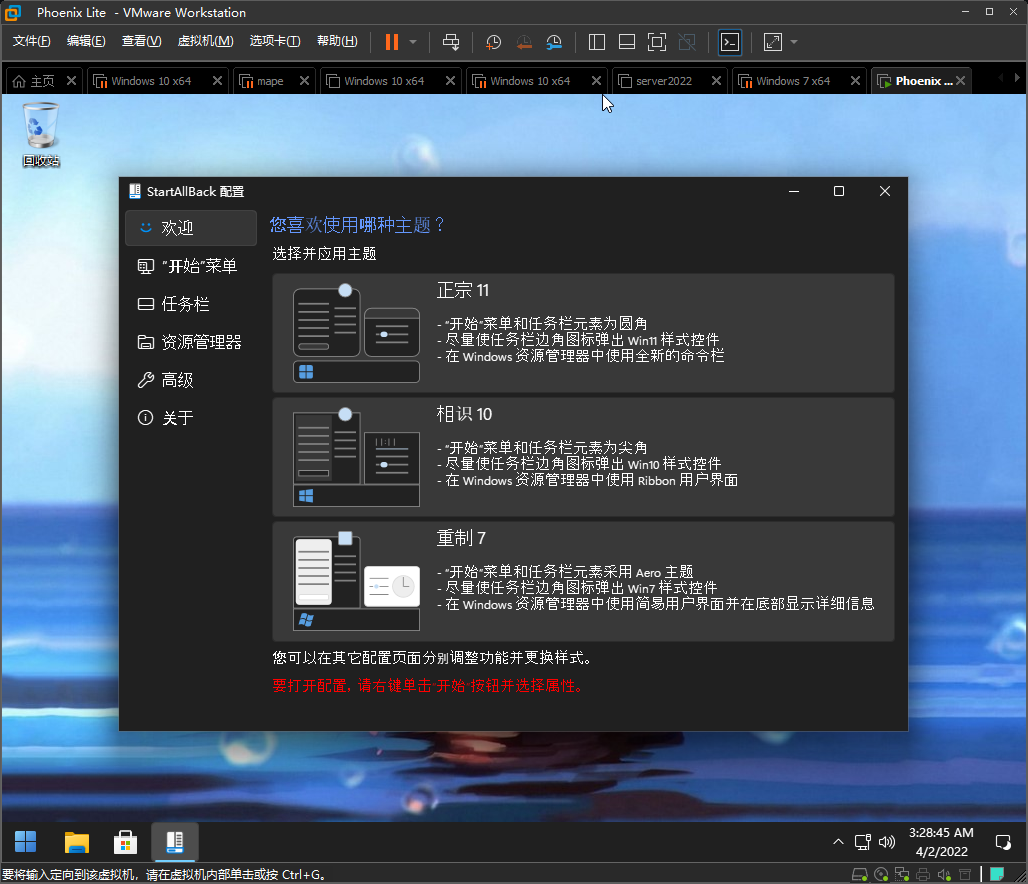首次进入系统,会让你选择喜欢的开始菜单风格,其实是整合了 StartAllBack 这款软件。这个软件也支持调整任务栏样式、如透明度、使用经典的右键菜单等。