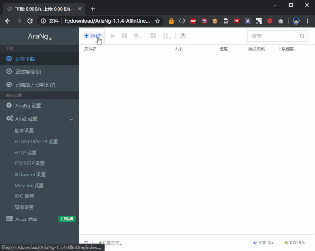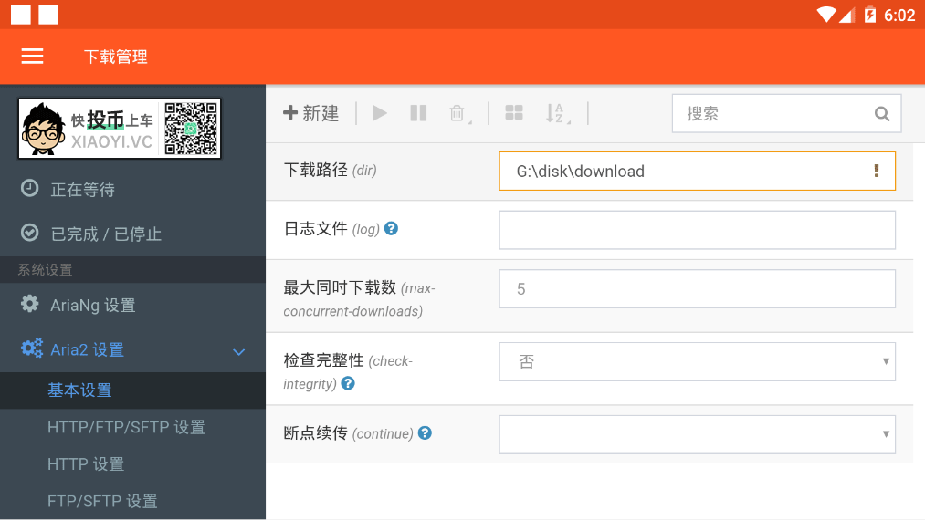 手机端安装好后,进入网页端的 Aria2 配置下,找到 AriaNG设置 → 找到 RPC,然后设置 RPC地址 和 端口 ,输入手机的IP和端口,密匙。正确设置后就可以进行下载文件了。