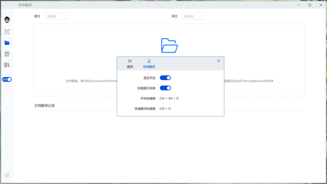 划词翻译方面,开启后支持全局划词,你在任何能选中文本的地方就可以翻译,支持快捷键和快速翻译快捷键。