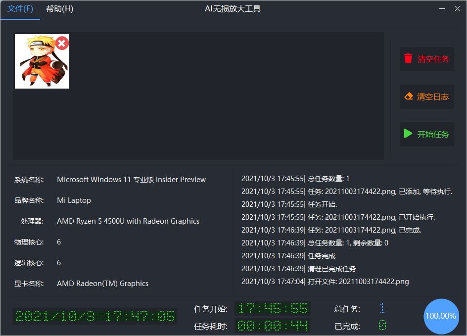 接着打开你需要无损放大的图片,格式支持 PNG\JPG\BMP,支持批量图片自动无损放大,然后点击开始任务,耐心等待一会。