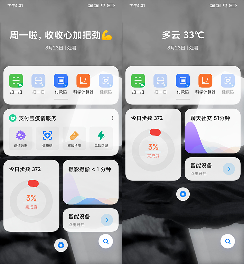 负一屏:现在的国产安卓系统基本上都支持负一屏功能,你可以直接在里面添加健康码的快捷方式或者添加整个支付宝疫情服务。