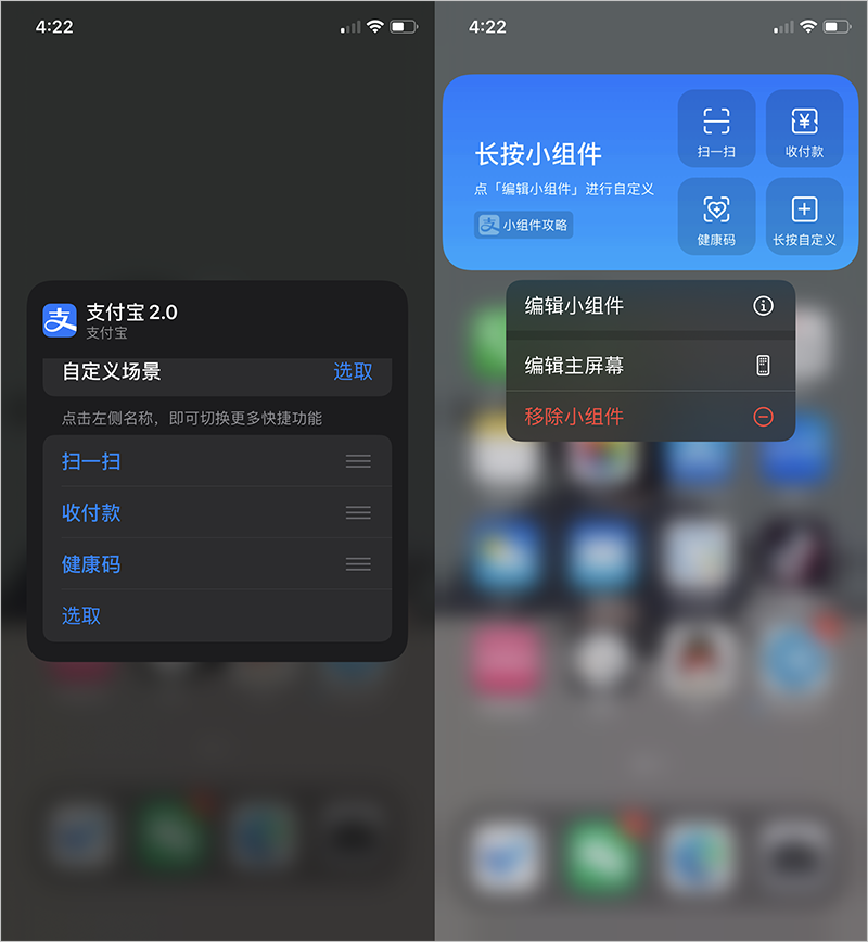 小组件方法:目前支付宝的小组件也支持了健康码快捷按钮,如果你有用桌面小组件功能的话,推荐用这个方法。长按桌面,添加小组件,找到支付宝,添加。