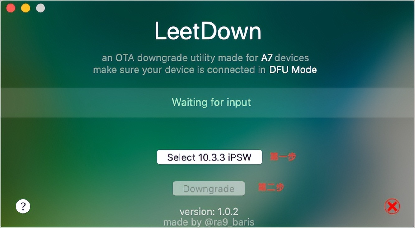 2.运行「LeetDown」软件,点击 Select 10.3.3 iPSW 选择下载好的 iOS 固件。