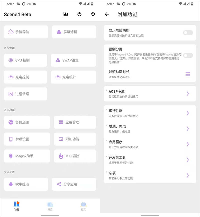 除了 Swap 内存扩容功能,Scene 也是折腾安卓手机的神器,支持对 CPU 以及内存进行调度设置,你可以对不同应用设置省电、均衡、性能、极速模式,以及应用场景设置。