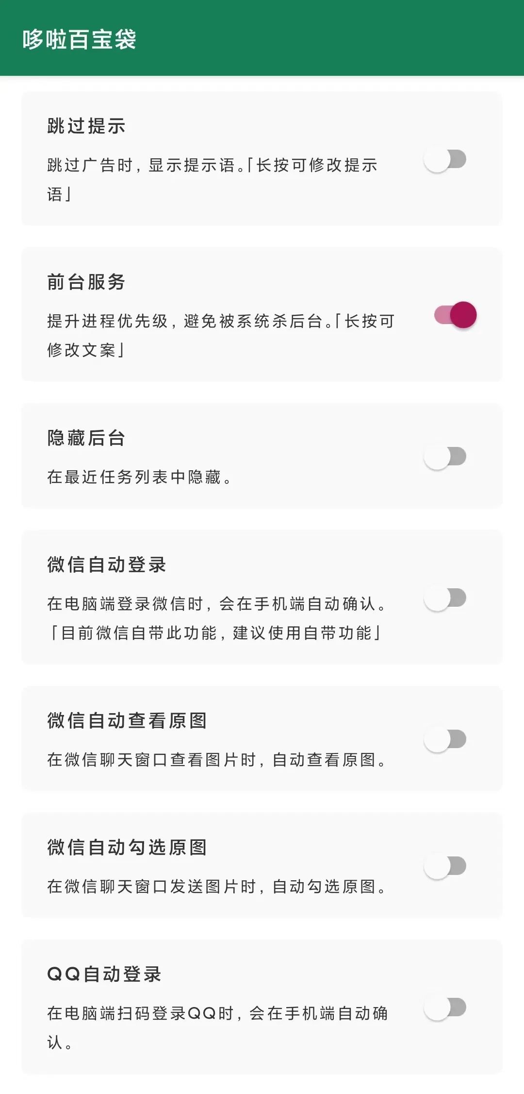 回到应用页面点击“更多”——“哆啦百宝箱”,取消跳过提示,开启前台服务,你也可以根据自己情况开启微信或QQ的自动登录。