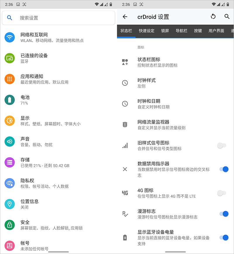 功能设置方面,除了具备 Android 11 有的功能外,在 crDroid 设置里面可以看到非常丰富的自定义功能,包括有状态栏、锁屏、导航、界面、通知栏、手势等等。